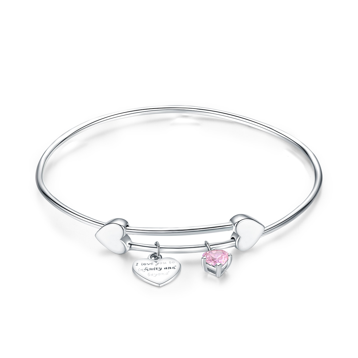 Descoperă brățara fixă din argint cu Inimă gravată "I love you to infinity and beyond" și Inimă roz din cristal de la Modart.ro și oferă un cadou unic și emoționant persoanei dragi!