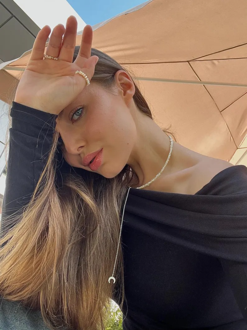Poți suprapune mai multe coliere cu pandantive maro, de lungimi diferite, pentru un efect subtil de strălucire.